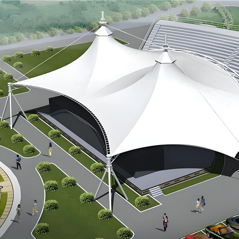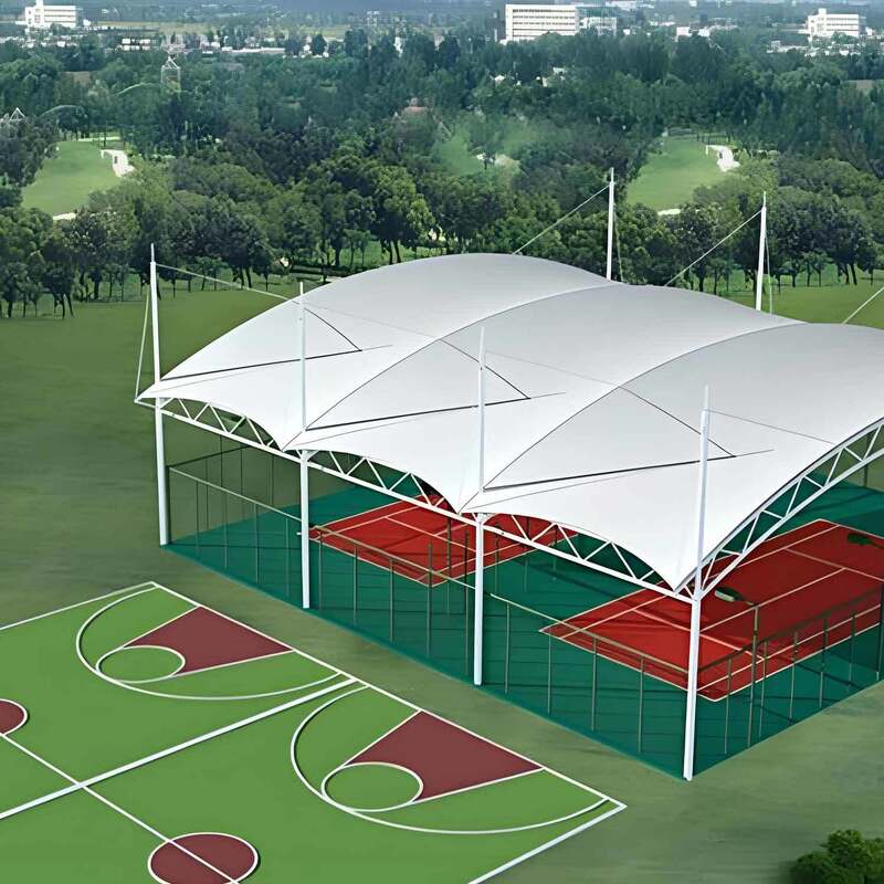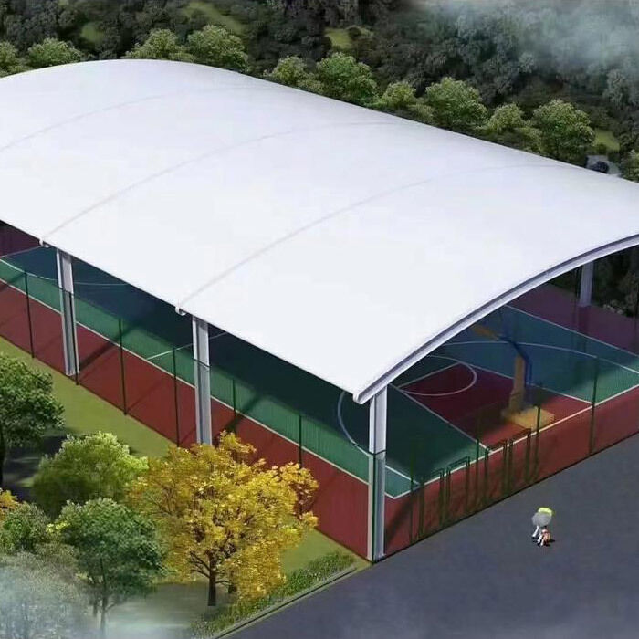 This PVDF building membrane has standard thicknesses 1.0mm to 1.03mm, widths 1000mm to 1800mm and lengths 50m 100m. Customizable colors are offered. It boasts excellent weather UV resistance self cleaning high strength flame retardancy and heat insulation, and is workable for stadium roof wall and tension membrane structure.
